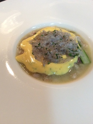 本来は魚醤を効かせたスペルト小麦のスープですが、僕は魚醤をザバイオーネという卵黄のソースに加え、生のシラスのマリネをトッピング。